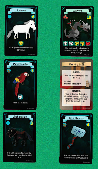 Examples of the cards from the Stables, Wyvern Roost, King’s Keep, and Town Hall decks: